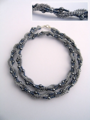 Halvlngt halsband med gr och mrkt grbl rocailles samt stlgr glasprlor. Fltat med fyra trdar, ganska pilligt men roligt!